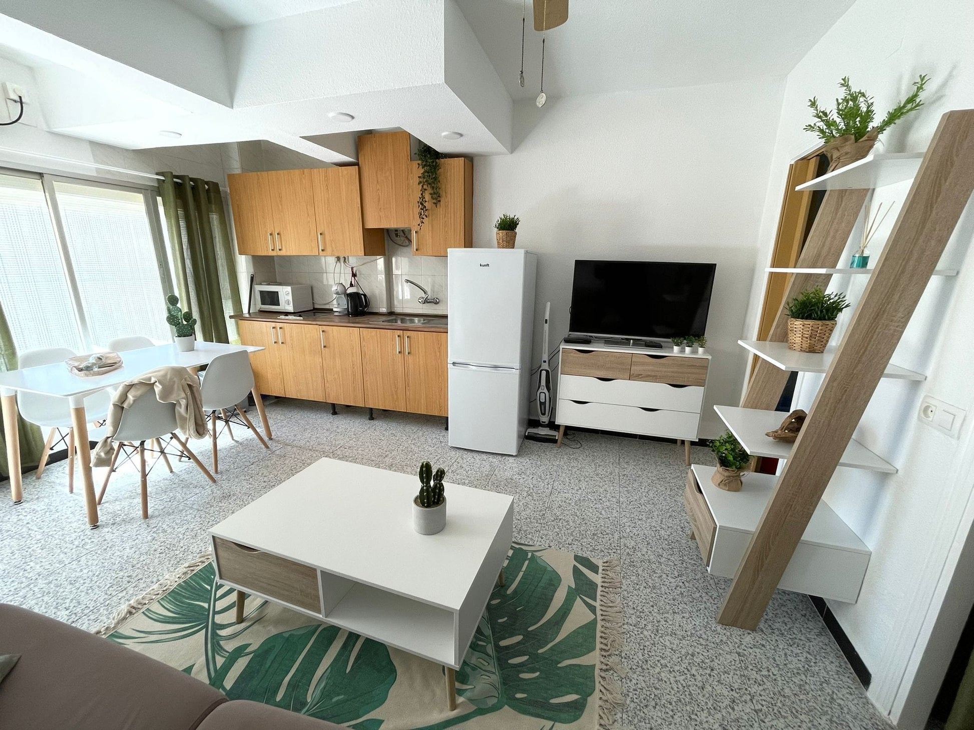 Een kattensprong tot in het winkelstraatje en naar de strandboulevard. Aloha park is een keurig verzorgd complex met veel groen en een aantal zwembaden. De studio is van alle gemakken voorzien. Het nieuwe tweepersoonsbed met kleerkast en de nachtkastjes vormt een gezellig geheel in de daarvoor gecreëerde nis. De woonkamer beschikt over een luxe slaapbank, salontafel, Nederlandse tv, een 4 persoons eethoek en de keuken. De keuken is compleet ingericht met magnetron, koffiezetapparaat, waterkoker, tweepits kookplaat en een koel-/vriescombinatie. De kleine knusse badkamer met douche bevat eveneens een wasmachine.